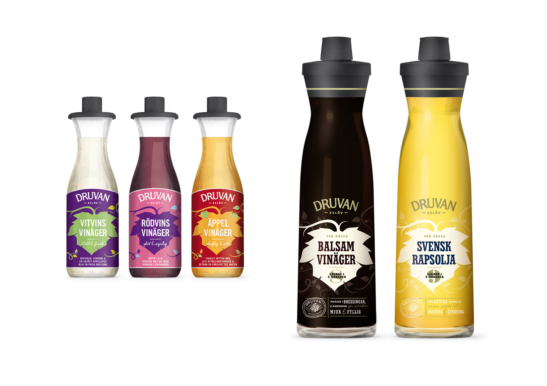 Druvan literally means ‘The Grape’. The winning concept used the simple approach of a vine leaf graphic as a link to the brand name, and as a means to highlight flavours within the range. It stems from Druvan’s vinager-producing roots and references the original vine leaf illustration once used.
